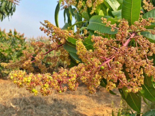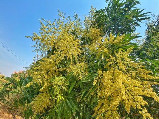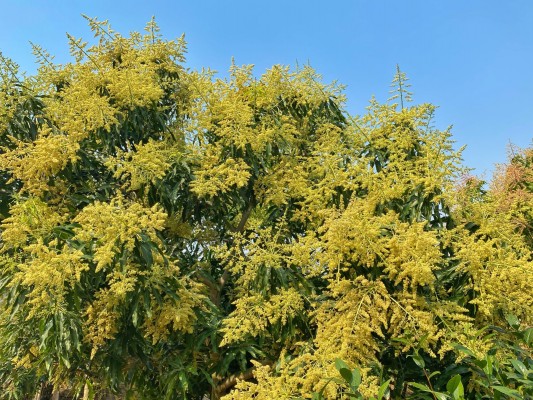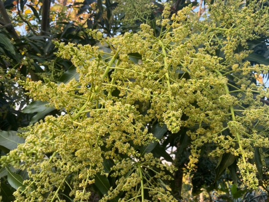 淡黄色的芒果花喜欢重重叠叠团抱而生,花簇浓密。