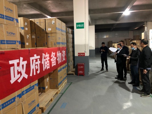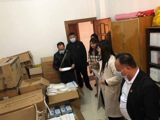 第一监督检查组到县昆医药公司查看县级疫情物资储备情况。(杨黎森 摄)
