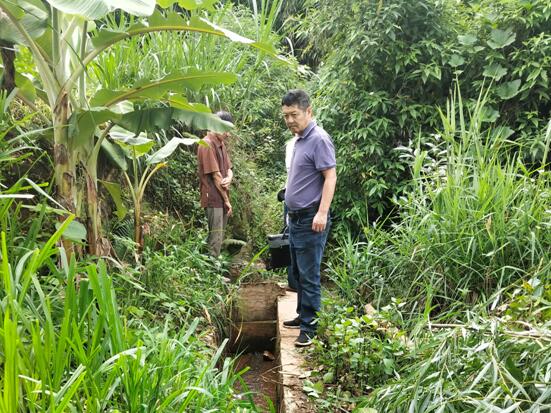 第六巡察组组长对群众反映灌溉土沟改建成三面光沟后却无法正常通水的问题进行实地核查。(罗仕月 摄)