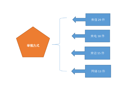 从举报方式看,来信29件,占38.67%;来电18件,占24%;来访15件,占20%;网络13件,占17.33 %。