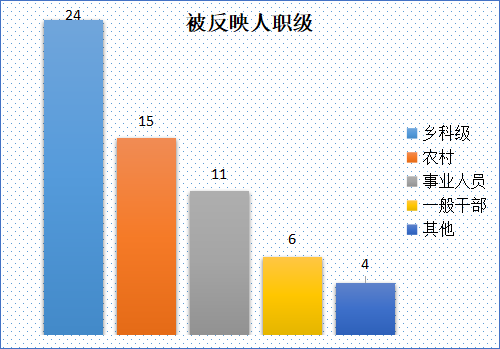 从被反映人职级看,反映乡科级24人,占40%;农村15人,占25%;事业人员11人,占18.33%;一般干部6人,占10%;其他4人,占6.67%。