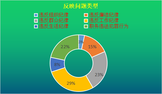 从反映问题类型看,违反组织纪律2件,占3.33%;违反廉洁纪律9件,占15%;违反群众纪律14件,占23.33%;违反工作纪律17件,占28.33%;违反生活纪律5件,占8.33%;职务违法犯罪行为13件,21.67%。(李秋瑾)