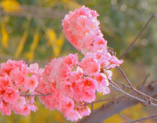 一枝樱花开得正艳,小小的花朵相互簇拥着,变成了一团粉色的大花球。