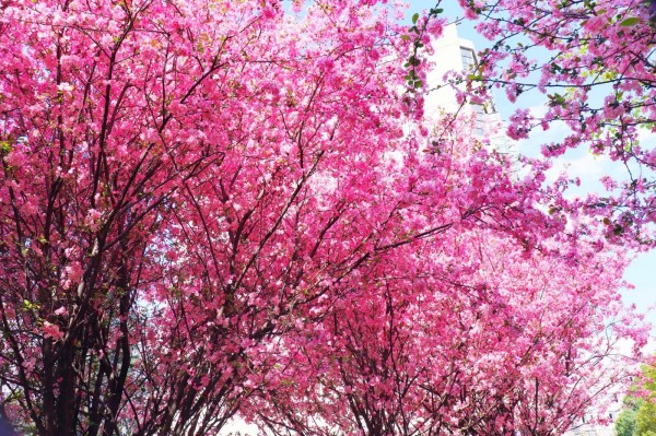 抬头仰望,红艳的樱花与高高的楼房互较高低,直插云霄,已将天地连了起来。