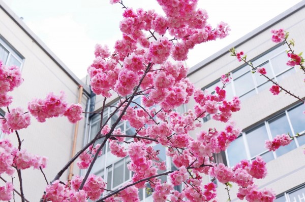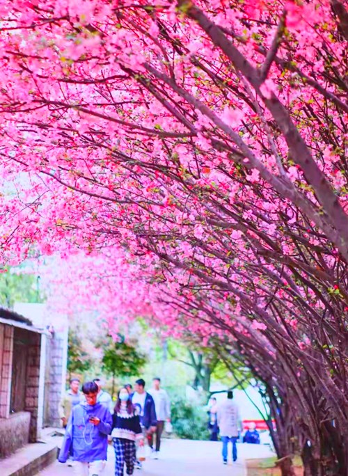 校园里的樱花开得正艳,高大的树干撑起了一路火红的樱花大道,和来来往往的青春身影构成了最靓丽的风景。