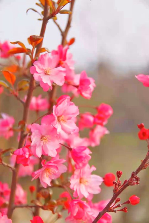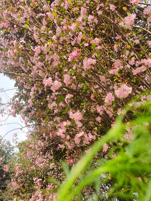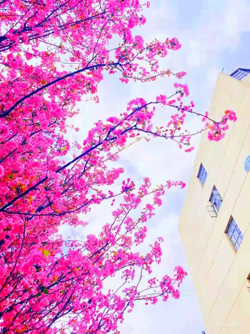 绚烂的樱花绽放枝头,层层叠叠,前推后拥,天空都被那一树树火红渲染成了亮眼的红色,春天的气息扑面而来。