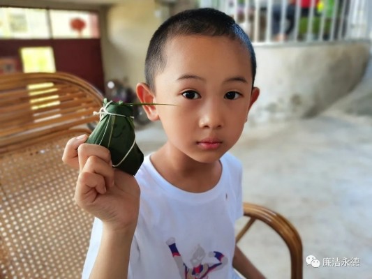 小男孩很认真的包了个粽子,并仔细画了个笑脸,祝愿端午安康。(李正丽 摄)