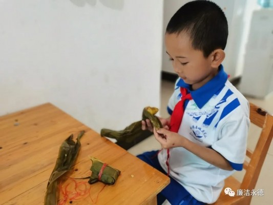 小朋友给妈妈展示在学校新学的包粽子方法,满脸的自信。(茶茗 摄)