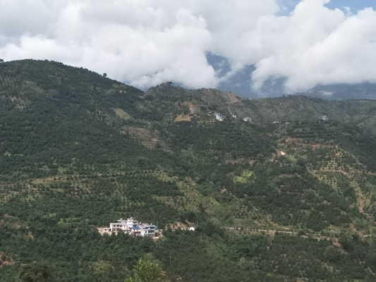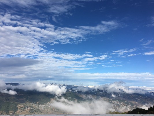 抬眼远眺,云朵遮住了耀眼的阳光,天空更显碧蓝。村庄和山峦在薄雾和白云间时隐时现,仿佛置身人间仙境。(罗剑飞 摄)