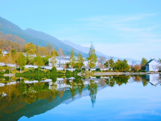 盛夏的午后,没有一丝风,平静的湖面倒映着蓝天白云、民居绿树,一切美不胜收。(郭丹阳 摄)