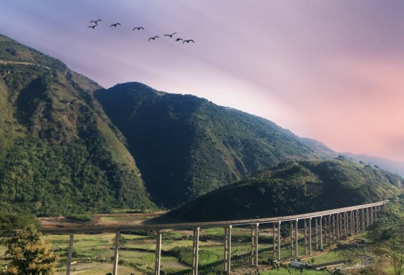 远处的青山一片葱茏,山脚下生长繁茂的各种农作物使乡间田园穿戴上了青纱绿帐。高空中飞过的雁群和天边的绛紫更为夏日增添了色彩。(郭丹阳 摄)