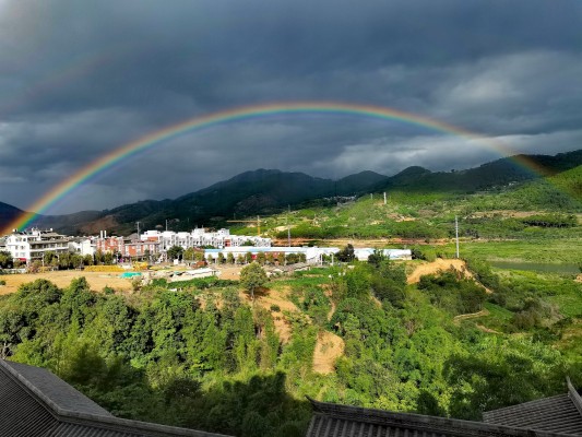 阵雨过后,那边的乌云还未散去,这边美丽的彩虹已挂在空中。(李正丽 摄)