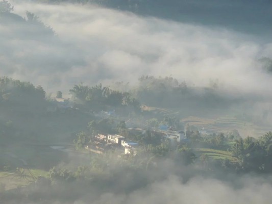“空山新雨后,天气晚来秋。”村庄、山峦、薄雾、庄稼……薄薄的雾气笼罩大地,覆盖村庄,显得和谐、宁静,风光旖旎、民风淳朴,构成了一副美丽的画卷。秋,没有夏的炽热,冬的严寒,只有淡淡的风、柔柔的云,收获整年的希望。