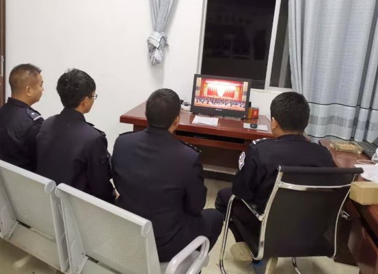 几名基层民警聚拢在一起通过手机观看警示专题片。