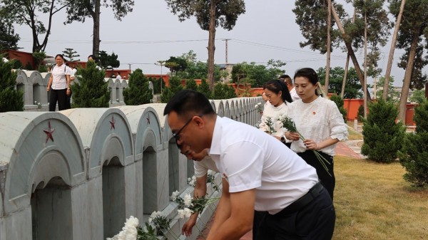 活动中,全体党员集体向先烈默哀致敬,紧接着两名党员干部肃穆前行庄重地向烈士纪念碑敬献花圈,全体党员干部依次有序地向英烈敬献鲜花,向烈士表达无限哀思。