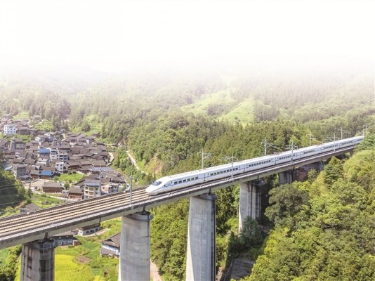 一列高铁行驶在贵州省黔东南苗族侗族自治州从江县境内。 图片来源:视觉中国