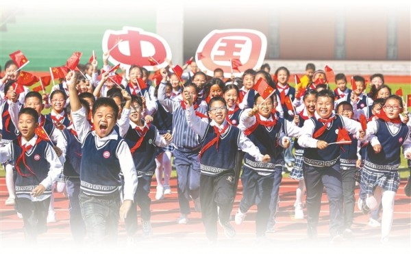 江苏省淮安市生态文旅区沁春路小学开展“美好祝福献祖国”活动,庆祝新中国成立75周年。 图片来源:视觉中国