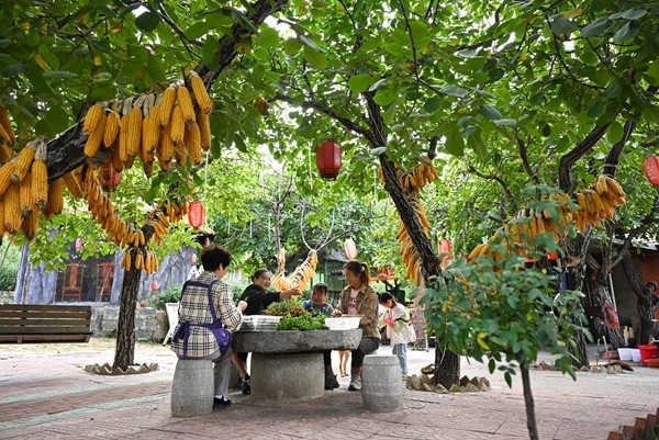 9月21日,山东滕州,龙泉山脚下的一家农家乐店外,服务员正在为中午营业做准备。 图片来源:视觉中国