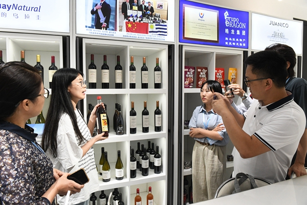 9月10日,西部陆海新通道国际消费中心,工作人员介绍乌拉圭蜂蜜酒。目前,该中心已引入23个国家的上万个单品,可一站式把“世界”买回家。图片来源:视觉中国